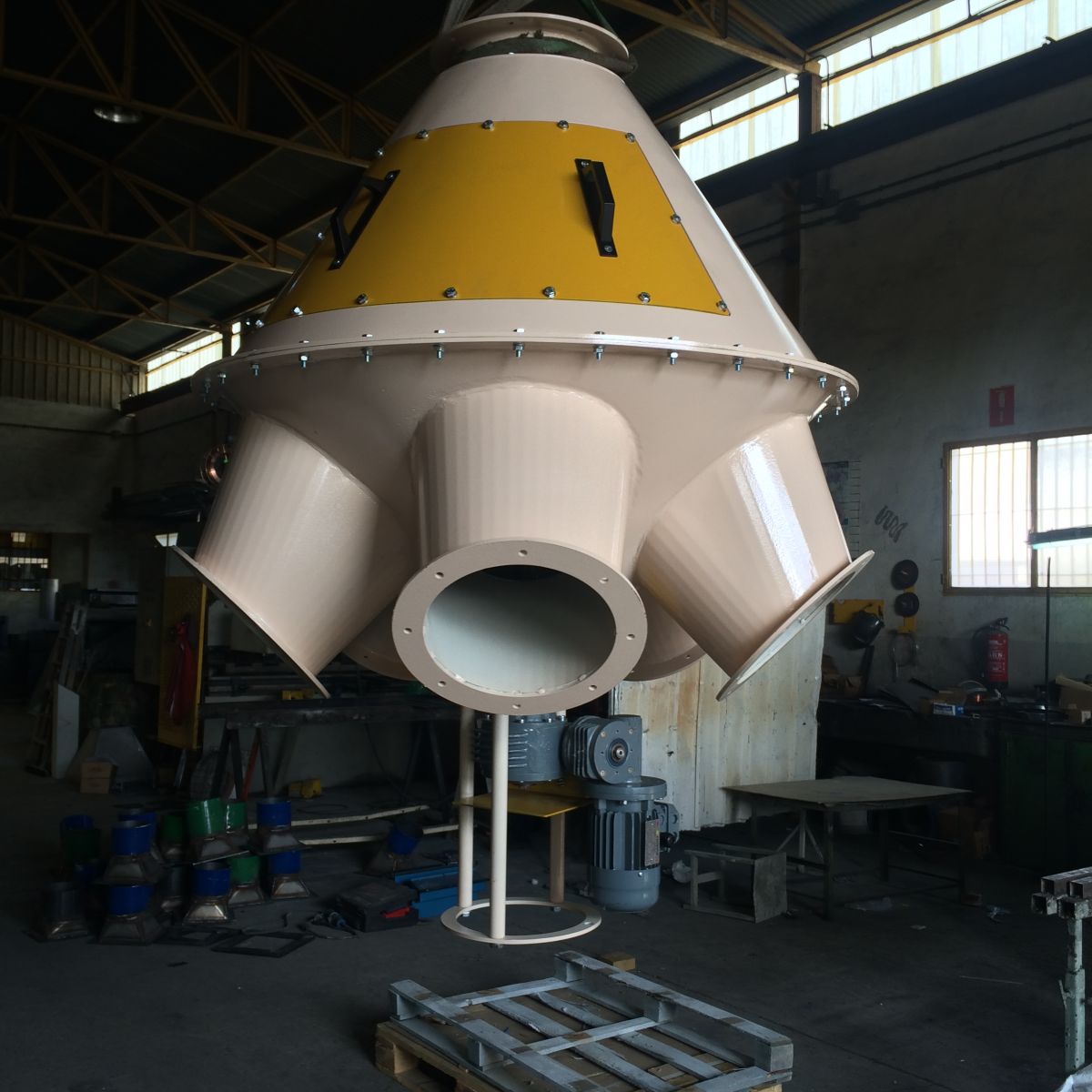 Distribuidor con dos bocas de registro de grandes dimensiones, accionado con motorreductor y control de posicionamiento mediante detectores inductivos.